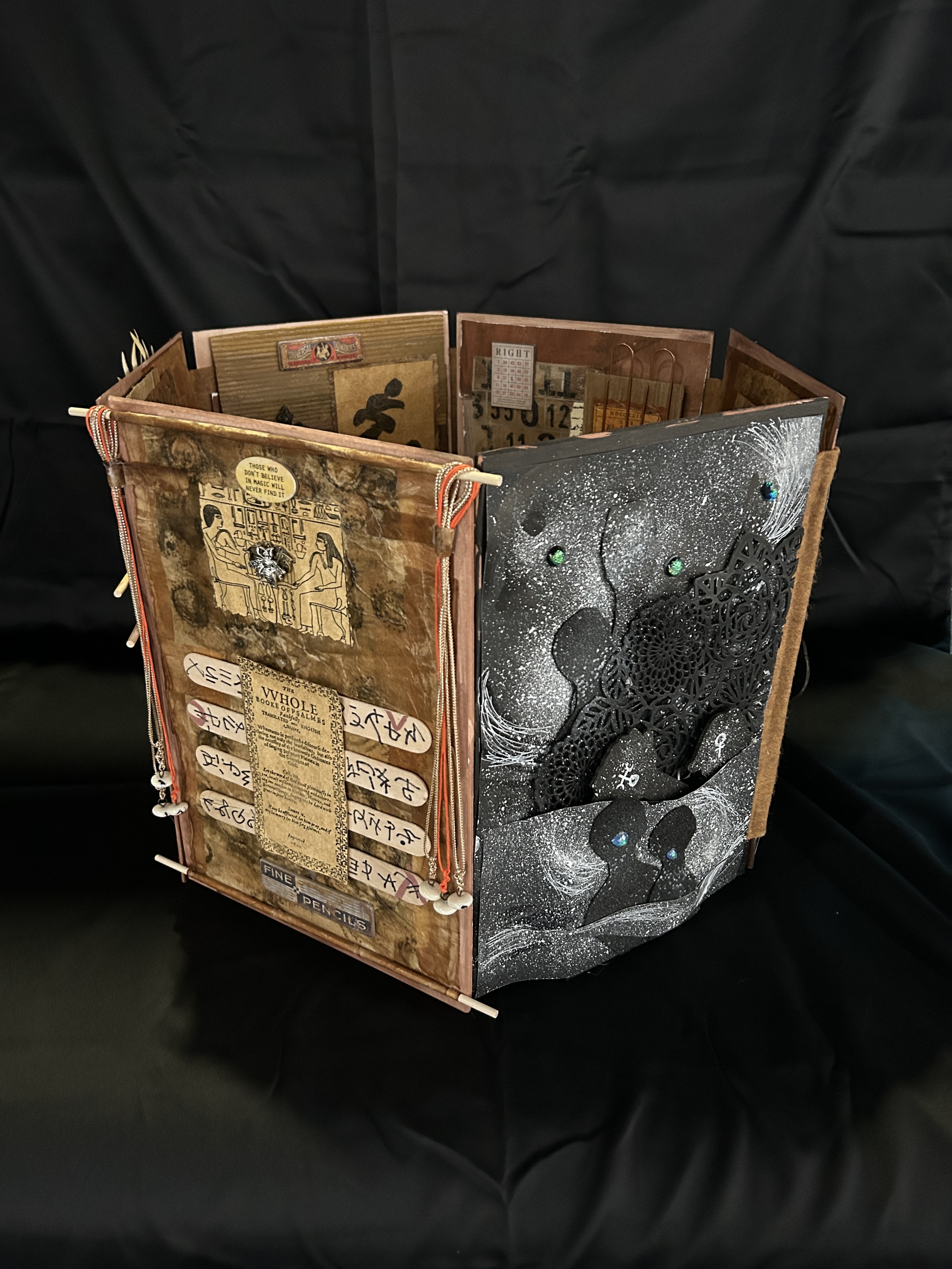 This six-sided art book is shaped like a honeycomb in the Sacred Hive of the Queen Bee. This installation has an interior space that viewers can peer into and see the ancient world greeting its current inhabitants. The outer honeycomb portends to a future world beyond this one.